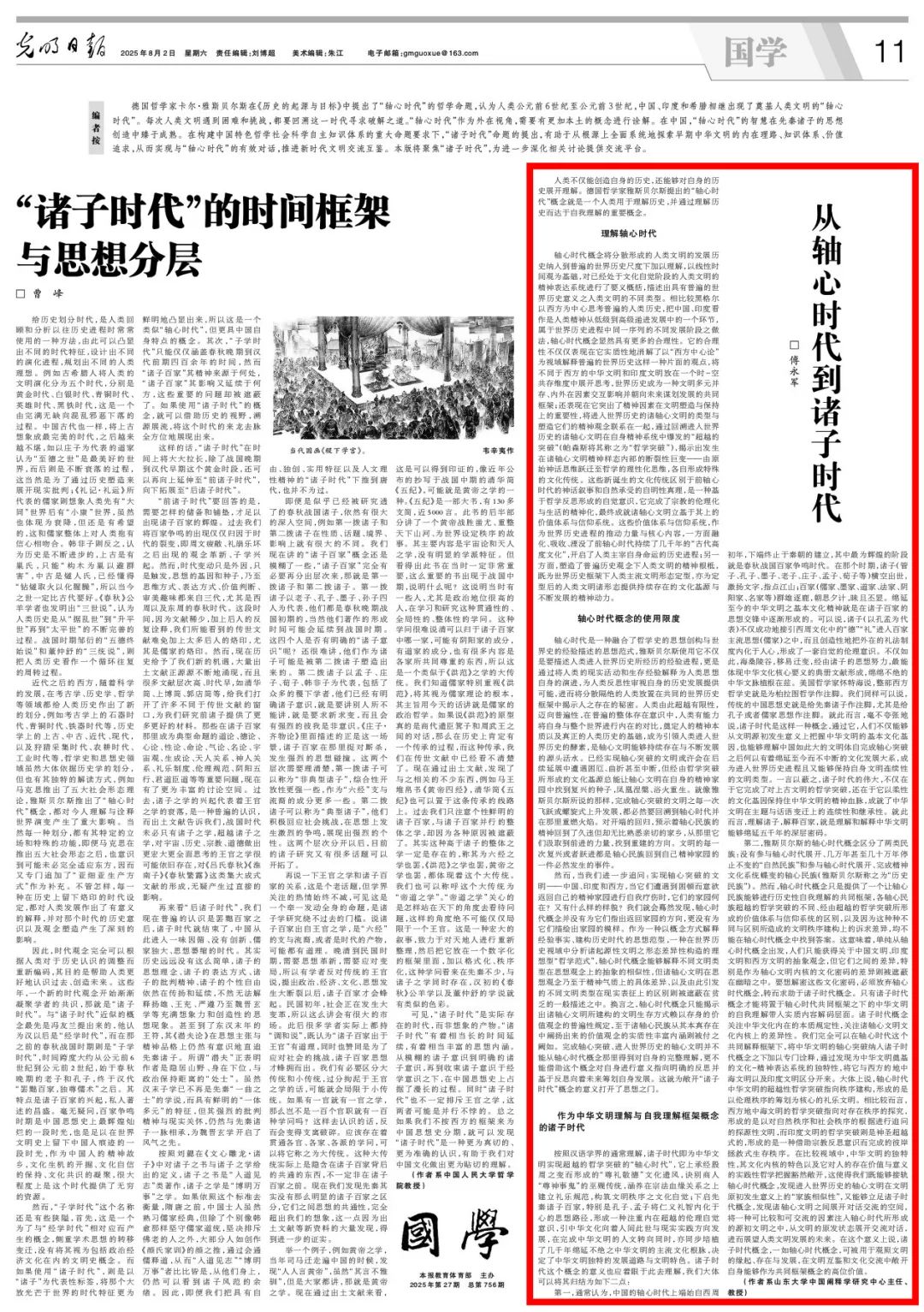 傅永军 | 从轴心时代到诸子时代发表时间:2025-08-04 14:45来源:《光明日报》2025年8月2日第11版 ![]() 人类不仅能创造自身的历史,还能够对自身的历史展开理解。德国哲学家雅斯贝尔斯提出的“轴心时代”概念就是一个人类用于理解历史,并通过理解历史而达于自我理解的重要概念。 理解轴心时代 轴心时代概念将分散形成的人类文明的发展历史纳入到普遍的世界历史尺度下加以理解,以线性时间观为基础,对已经处于文化自觉阶段的人类文明的精神表达系统进行了要义概括,描述出具有普遍的世界历史意义之人类文明的不同类型。相比较黑格尔以西方为中心思考普遍的人类历史,把中国、印度看作是人类精神从低级到高级递进发展中的一个环节,属于世界历史进程中同一序列的不同发展阶段之做法,轴心时代概念显然具有更多的合理性。它的合理性不仅仅表现在它实质性地消解了以“西方中心论”为视域解释普遍的世界历史这样一种片面的观点,将不同于西方的中华文明和印度文明放在一个时-空共存维度中展开思考,世界历史成为一种文明多元并存、内外在因素交互影响并朝向未来谋划发展的共同框架;还表现在它突出了精神因素在文明塑造与保持上的重要性,将进入世界历史的诸轴心文明的类型与塑造它们的精神观念联系在一起,通过回溯进入世界历史的诸轴心文明在自身精神系统中爆发的“超越的突破”(帕森斯将其称之为“哲学突破”),揭示出发生在诸轴心文明精神样态内部的断裂性巨变——由原始神话思维跃迁至哲学的理性化思维,各自形成特殊的文化传统。这些新诞生的文化传统区别于前轴心时代的神话叙事和自然承受的自明性真理,是一种基于哲学反思形成的自觉意识,它完成了宗教的伦理化与生活的精神化,最终成就诸轴心文明立基于其上的价值体系与信仰系统。这些价值体系与信仰系统,作为世界历史进程的推动力量与核心内容,一方面融化、吸收、湮没了前轴心时代持续了几千年的“古代高度文化”,开启了人类主宰自身命运的历史进程;另一方面,塑造了普遍历史观念下人类文明的精神根柢,既为世界历史框架下人类主流文明形态定型,亦为定型后的人类文明诸形态提供持续存在的文化基源与不断发展的精神动力。 轴心时代概念的使用限度 轴心时代是一种融合了哲学史的思想创构与世界史的经验描述的思想范式,雅斯贝尔斯使用它不仅是要描述人类进入世界历史所经历的经验进程,更是通过将人类的现实活动和生存经验解释为人类思想自身的演进,为人类反思性审视自身的历史发展提供可能,进而将分散隔绝的人类放置在共同的世界历史框架中揭示人之存在的秘密。人类由此超越有限性,迈向普遍性,在普遍的整体存在意识中,人类有能力将自身与整个世界进行内在的对比,奠定人的精神本质以及真正的人类历史的基础,成为引领人类进入世界历史的酵素,是轴心文明能够持续存在与不断发展的源头活水。已经实现轴心突破的文明或许会在后续延展中遭遇困厄、曲折甚至中断,但经由哲学突破所形成的文化基源总能让轴心文明在自身的精神家园中找到复兴的种子,凤凰涅槃、浴火重生。就像雅斯贝尔斯所说的那样,完成轴心突破的文明之每一次飞跃或螺旋式上升发展,都必然要回溯到轴心时代并在那里重燃火焰。对开端的回归,预示着轴心民族的精神回到了久违但却无比熟悉亲切的家乡,从那里它们汲取到前进的力量,找到重建的方向。文明的每一次复兴或者跃进都是轴心民族回到自己精神家园的一件必然发生的事件。 然而,当我们进一步追问:实现轴心突破的文明——中国、印度和西方,当它们遭遇到困顿而意欲返回自己的精神家园进行自我疗伤时,它们的家园何在?又有什么样的样貌?我们就会蓦然发现,轴心时代概念并没有为它们指出返回家园的方向,更没有为它们描绘出家园的模样。作为一种以概念方式解释经验事实、建构历史时代的思想范型,一种在世界历史视域中分析诸起源性文明之形态差异性构造的理想型“哲学范式”,轴心时代概念能够解释不同文明类型在思想观念上的抽象的相似性,但诸轴心文明在思想观念乃至于精神气质上的具体差异、以及由此引发的不同文明类型在现实表征上的区别则被遮蔽在贫乏的一般描述之中。换言之,轴心时代概念只能揭示出诸轴心文明所建构的文明生存方式赖以存身的价值观念的普遍性规定,至于诸轴心民族从其本真存在中阐扬出来的价值观念的实质性丰富内涵则被付之阙如。完成轴心突破、进入世界历史的轴心文明并不能从轴心时代概念那里得到对自身的完整理解,更不能借助这个概念对自身进行意义指向明确的反思并基于反思向着未来筹划自身发展。这就为敞开“诸子时代”概念的意义打开了思想之门。 作为中华文明理解与自我理解框架概念的诸子时代 按照汉语学界的通常理解,诸子时代即为中华文明实现超越的哲学突破的“轴心时代”,它上承经殷周之变而形成的“尊礼敬德”文化遗风,诀别商人“尊神事鬼”的巫觋传统,涵养在宗法血缘关系之上建立礼乐规范,构筑文明秩序之文化自觉;下启先秦诸子百家,特别是孔子、孟子将仁义礼智内化于心的思想路径,形成一种注重内在超越的伦理自觉意识,引中华文化向着人间此世与现实实践方向发展,在完成中华文明的